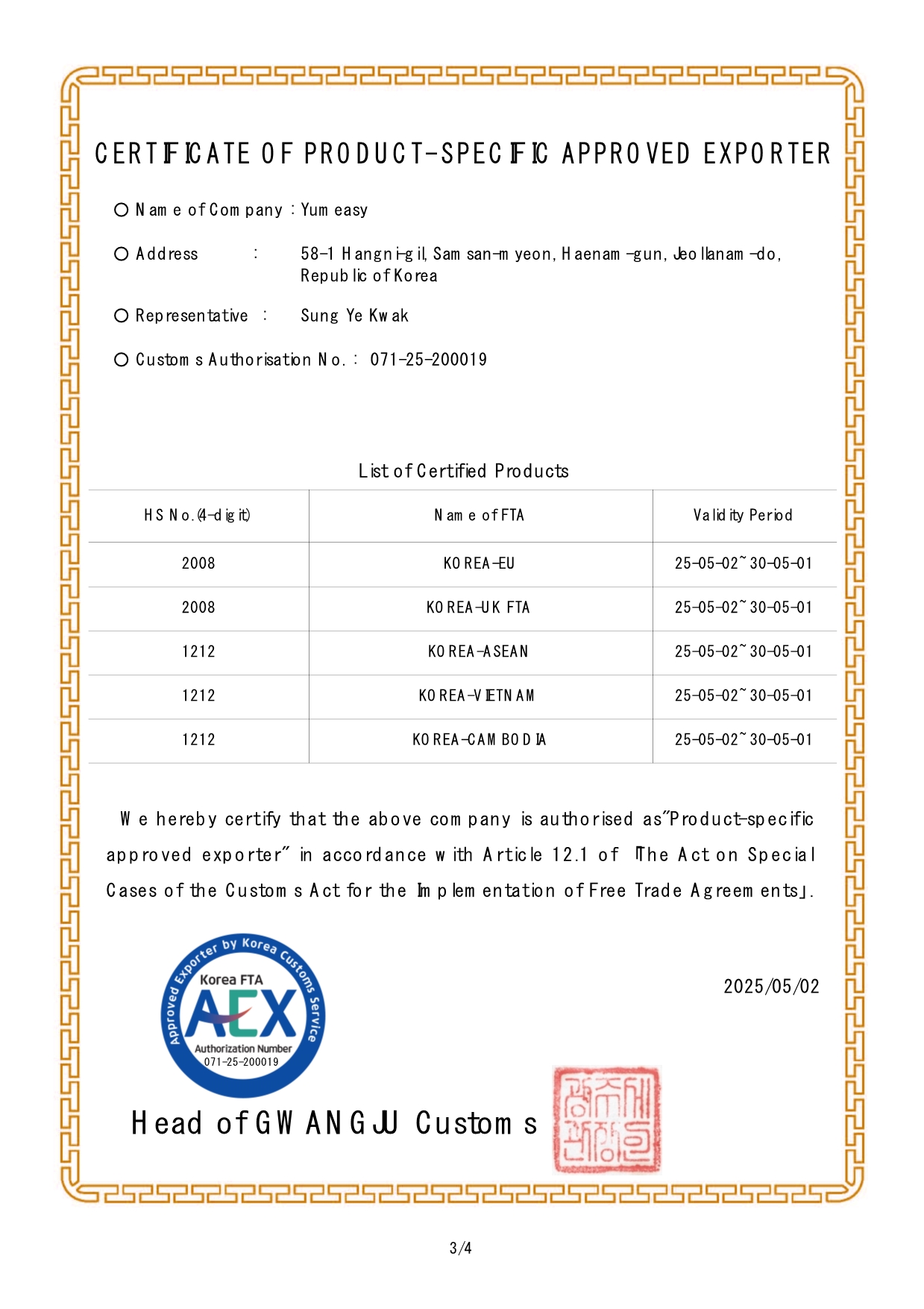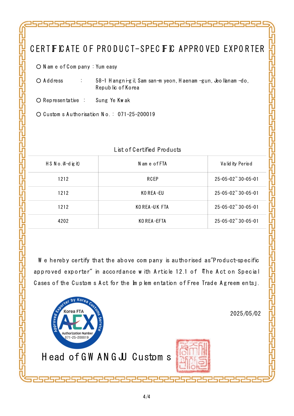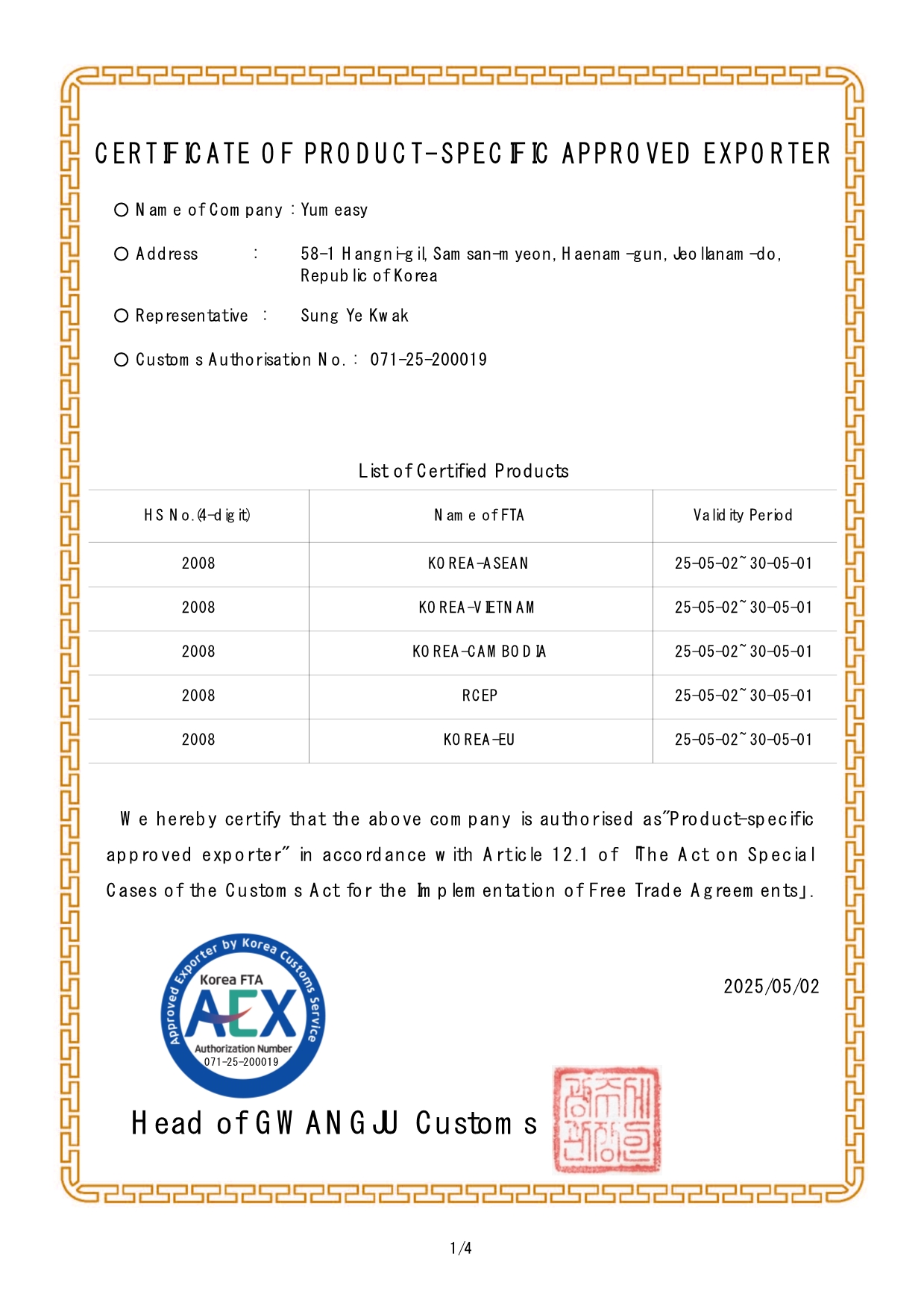 Approved Exporter of Origin Certification